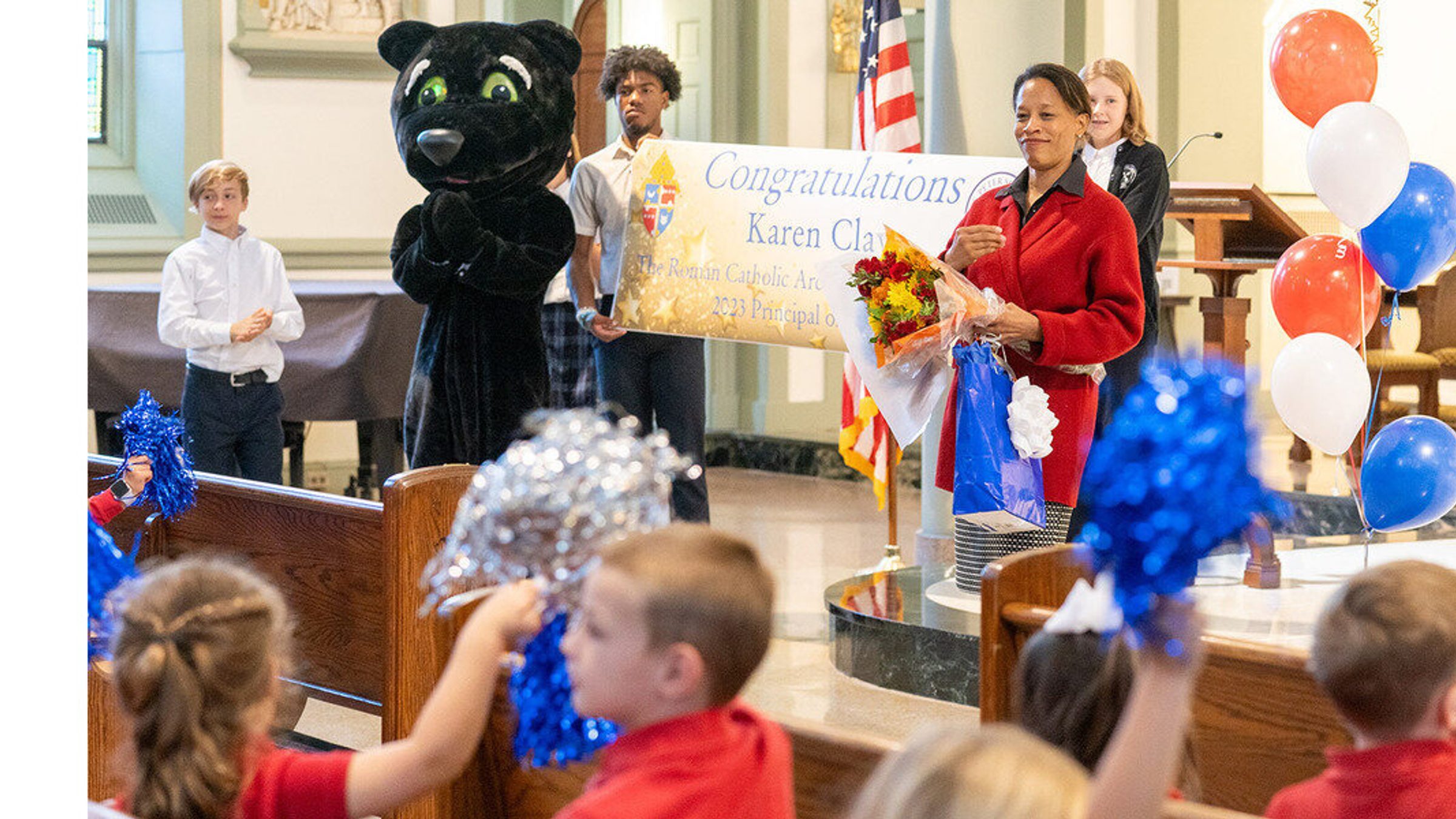 Students from St. Peter School on Capitol Hill waving silver and blue pom-poms greeted their surprised principal Karen Clay at St. Peter’s Church on Oct. 13. Clay, who was entering the church under the pretense of a different event, found out that she been named as the 2023-2024 Distinguished Principal of the Year for The Roman Catholic Archdiocese of Washington.